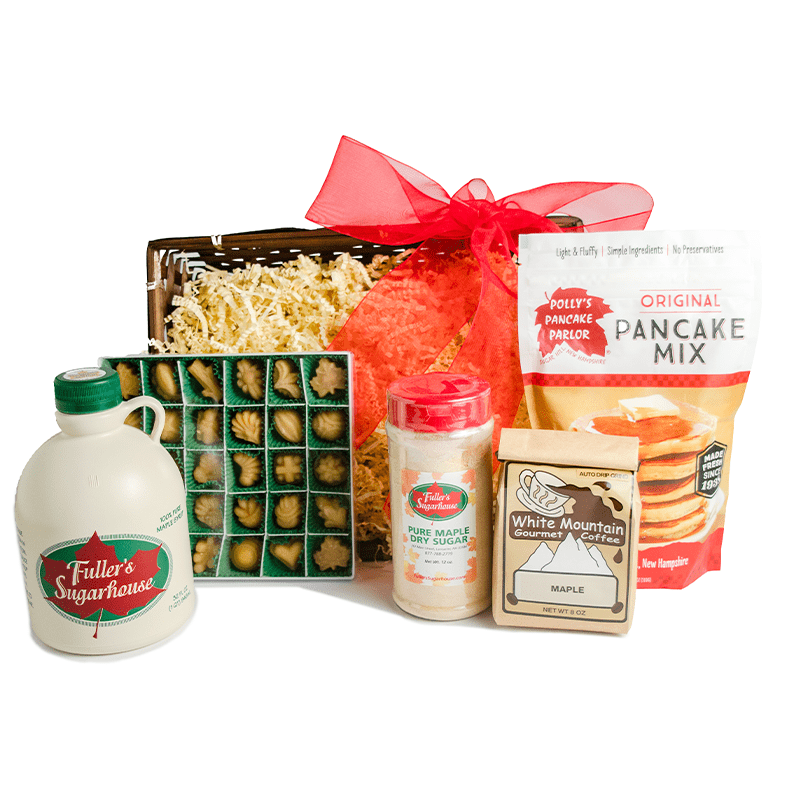 Customize a gift set that’s perfect for each recipient! Choose from a large collection of our pure NH maple products – syrup, candy, cream or sugar – alongside locally-produced pancake mix from Polly’s Pancake Parlor or a package of White Mountain Gourmet Coffee. This is a great way to build a product at the price point you are working with.